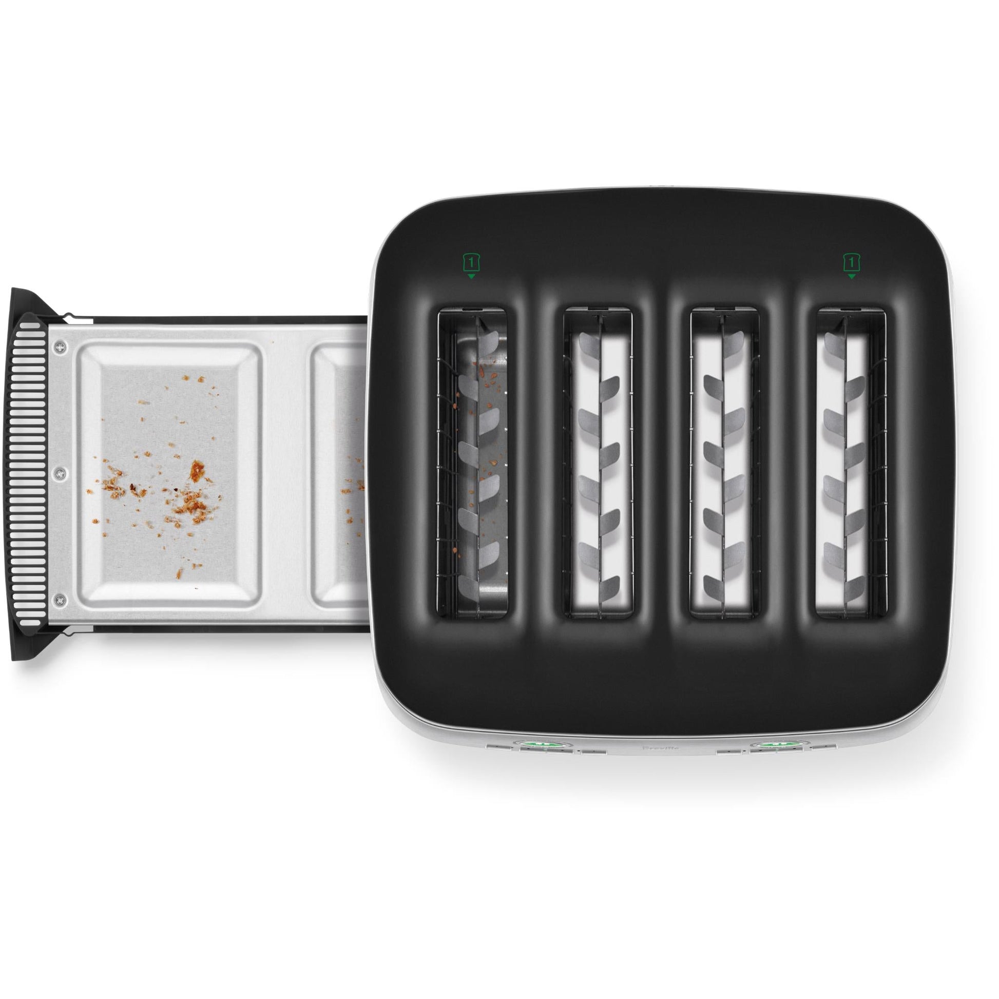 Designed for mess-free toasting with a non-stick ceramic coated top that prevents baked-on crumbs. The clearway cavity guides crumbs straight down into the catch-all crumb tray for easy emptying.