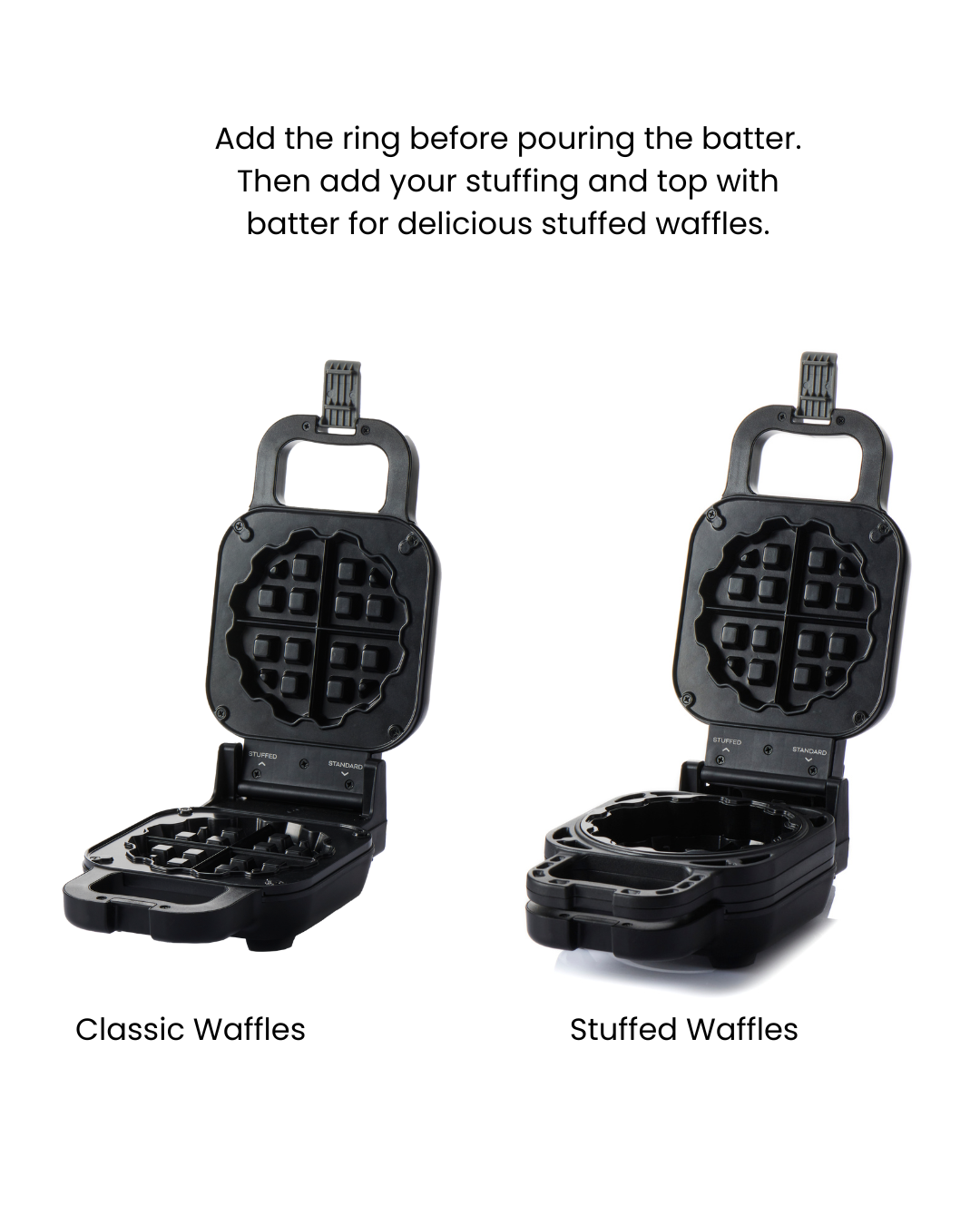 - Includes a waffle ring accessory to help create fully sealed stuffed waffles (e.g. with fruit, chocolate, cheese)