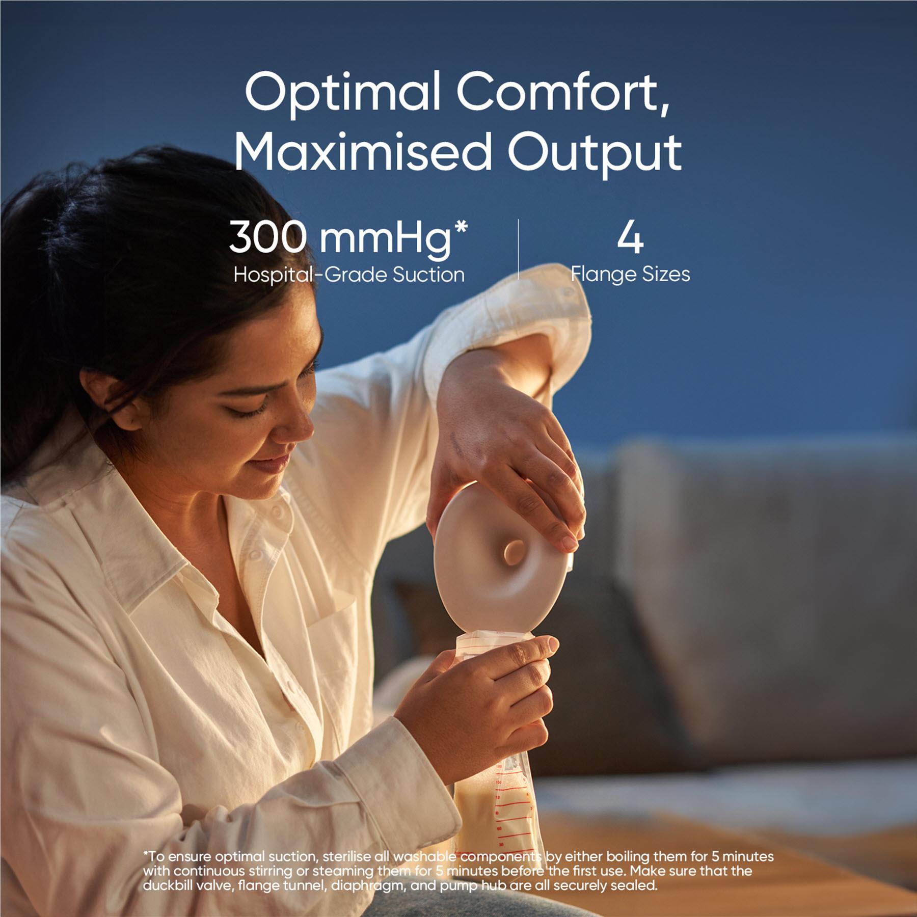 Designed to fit all nipple sizes with flange dimensions ranging from 17 mm to 24 mm. The ergonomic 105° design ensures a gentle and nurturing experience. Achieve maximum milk output with up to 300 mmHg* of safe, hospital-grade suction. Customise suction strength and cycle speed to suit your individual needs. Rest assured that all skin-contact components are crafted from BPA-free, food-grade materials.