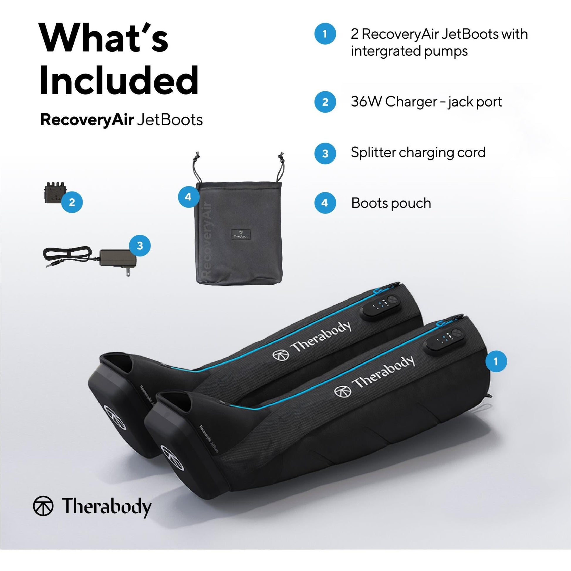 Therabody is revolutionizing pneumatic compression with the all-new RecoveryAir product line, the future of pressure massage. RecoveryAir JetBoots make recovery more convenient than ever without the need for cords. It eliminates the external pump and tubes, replacing them with integrated motors that are packed into a sleek, compact design for easy storage and on-the-go recovery. One-touch controls on the boots make for fast and easy use. With FastFlush Technology™, RecoveryAir JetBoots reach the optimal point for a full and rapid pressure release in just 60 seconds–making it 2-3x faster than competitors for rapid recovery. Ultra-portable, convenient and fast.